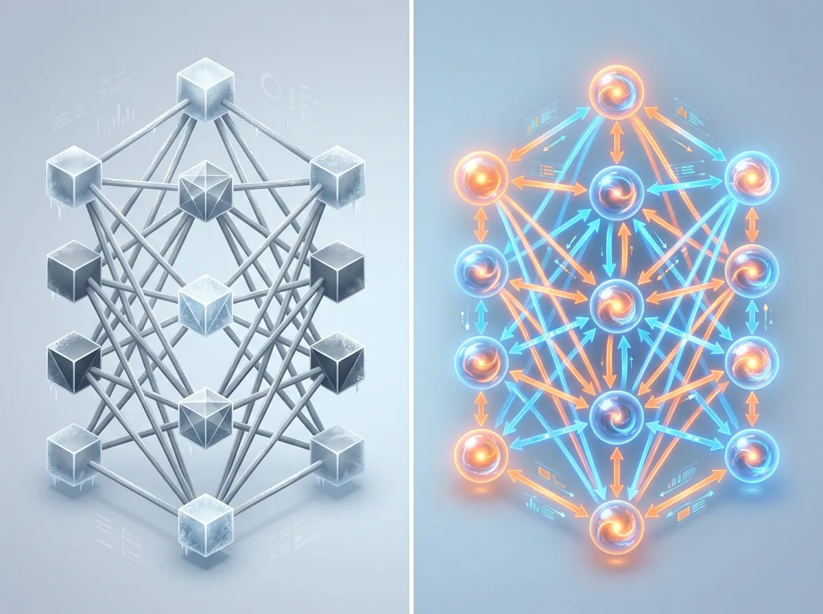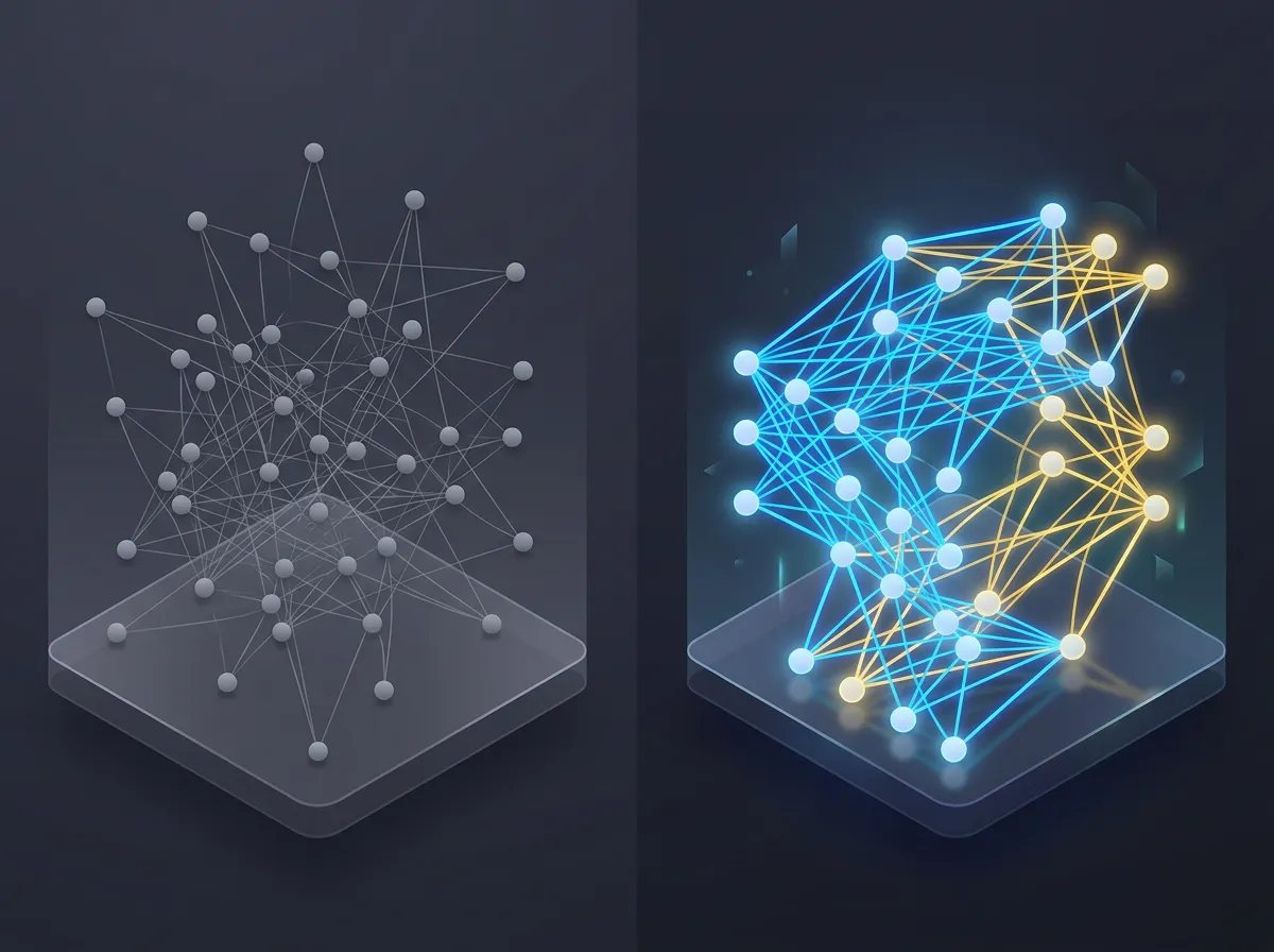 ואותו פרדוקס מופיע ברשת נוירונים מלאכותית לפני אימון: היא לא "חכמה" בגלל שהיא פתוחה לכל דבר. היא חסרת תועלת. רק כשהיא לומדת מדוגמאות, יוצרת משקולות, מצמצמת את מרחב האפשרויות – היא הופכת לשימושית.