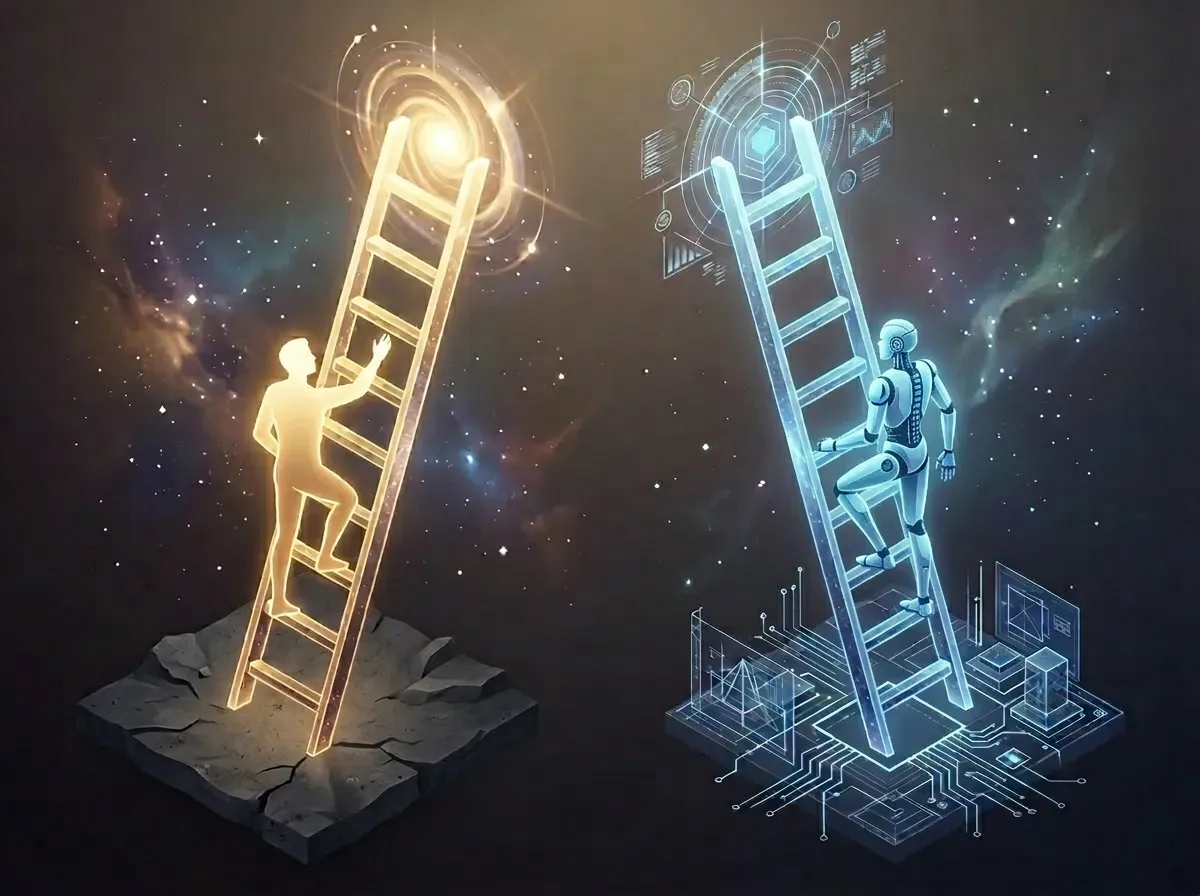 האדם מצטיין בעלייה (אם כי זה כישרון בוסרי שצריך לפתח אצל רוב בני האדם הבוגרים): לנטוש לרגע את מה שהוא יודע, לאפשר לתובנה חדשה לחדור, להביא זווית שאינה נגזרת לוגית מהתבניות הקיימות. הוא יכול לשאול "ומה אם אנחנו טועים בהנחת היסוד?" – שאלה שה-AI, כלוא בתבניות הכשרתו, לא ישאל מעצמו.