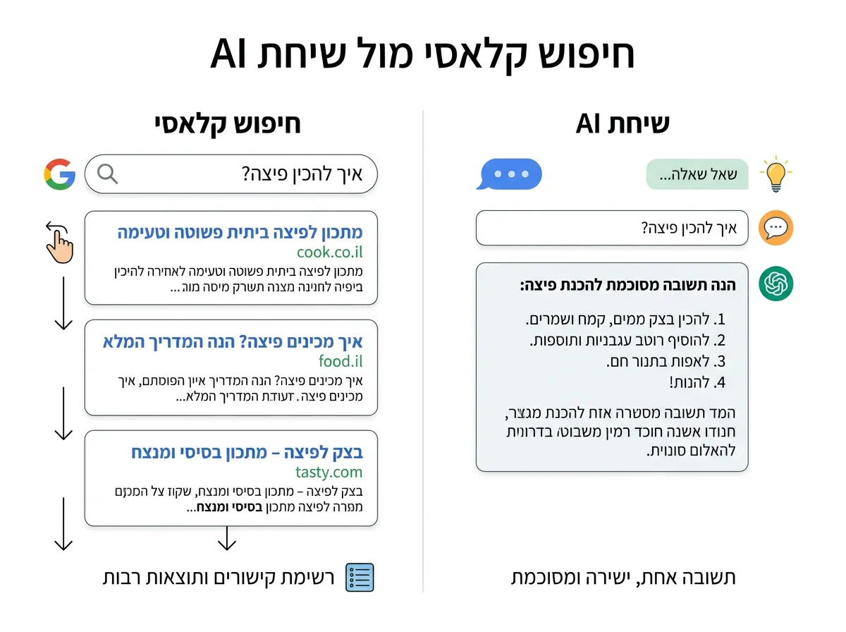 מה שחשוב להבין כבעל עסק הוא לא איך המכונה עובדת מבפנים, אלא מה השתנה בהרגלי הצרכנות. יותר ויותר אנשים, במקום להקליד מילות מפתח במנוע חיפוש ולגלול בין תוצאות, פונים ישירות אל מודלים כמו ChatGPT, Claude, Gemini או Copilot ומנהלים איתם שיחה. הם שואלים שאלות ומקבלים תשובה אחת, מסוכמת, מדויקת ומנוסחת. זו לא עתיד מדומיין, זה כבר קורה עכשיו בקנה מידה של מאות מיליוני שאילתות ביום.