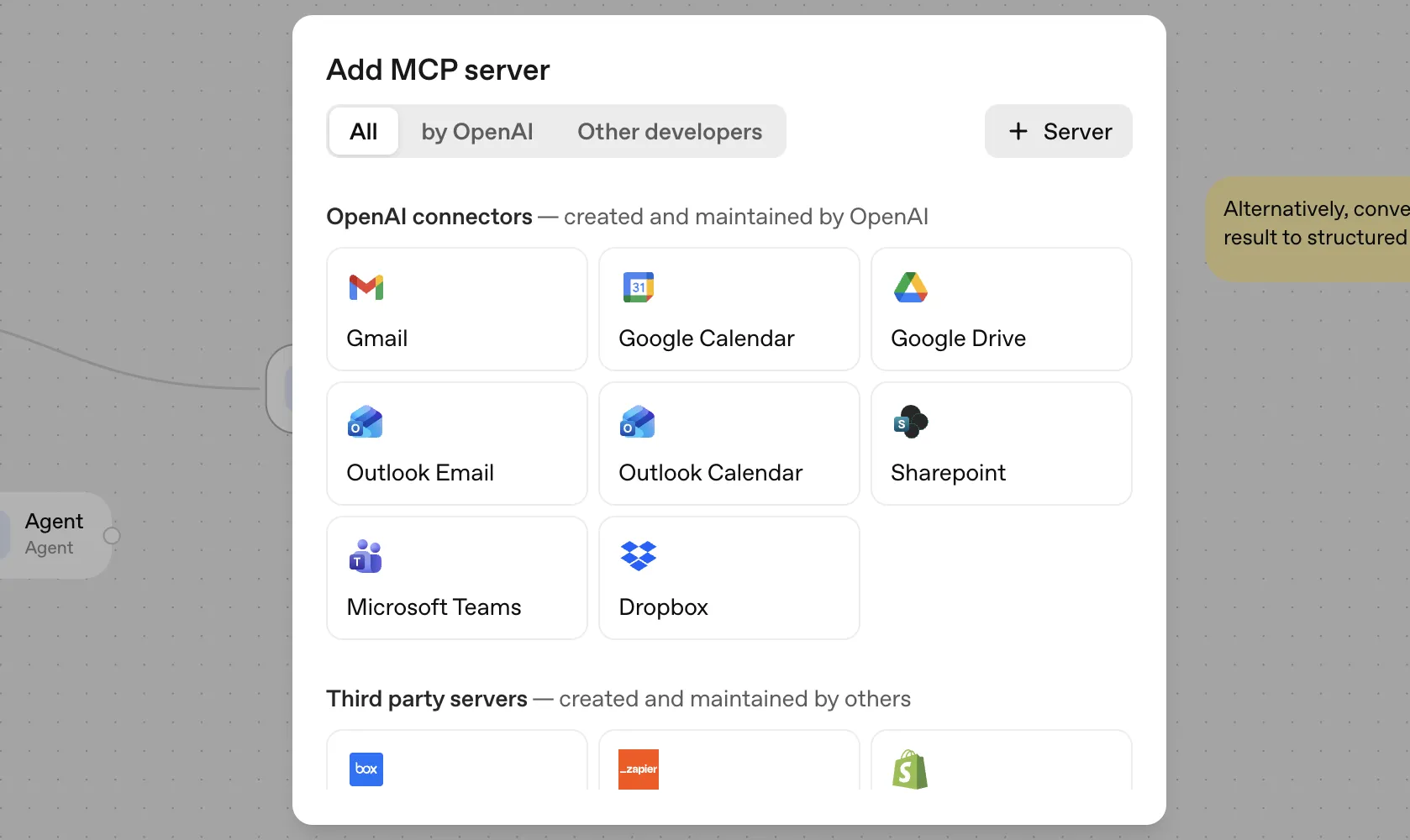 - בנוסף, OpenAI הוסיפה ביוני 2025 את Connector Registry – מערכת ניהול חיבורים שמרכזת את כל המקורות והכלים במקום אחד. המפתחים יכולים לבחור מחיבורים מוכנים למערכות כמו Dropbox, Google Drive, SharePoint ו-Teams, או להוסיף חיבורים מותאמים.